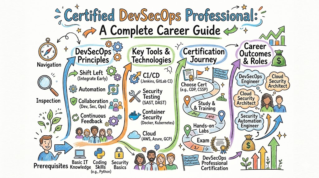 The Certified DevSecOps Professional program is designed to fix this problem. It helps working engineers and managers learn how to weave security into every step of the DevOps lifecycle in a practical, tool-driven way. Instead of treating security as a separate activity, you learn how to plug security checks into CI/CD, infrastructure, containers, and production operations.This master guide will explain what the Certified DevSecOps Professional program is, who it is meant for, what skills you build, and how to prepare for it in 7–14, 30, or 60 days. You will also see how this certification fits into bigger learning paths like DevOps, DevSecOps, SRE, AIOps/MLOps, DataOps, and FinOps, along with a role-based certification map, common mistakes, and FAQs focused on difficulty, time, prerequisites, value, and career growth.